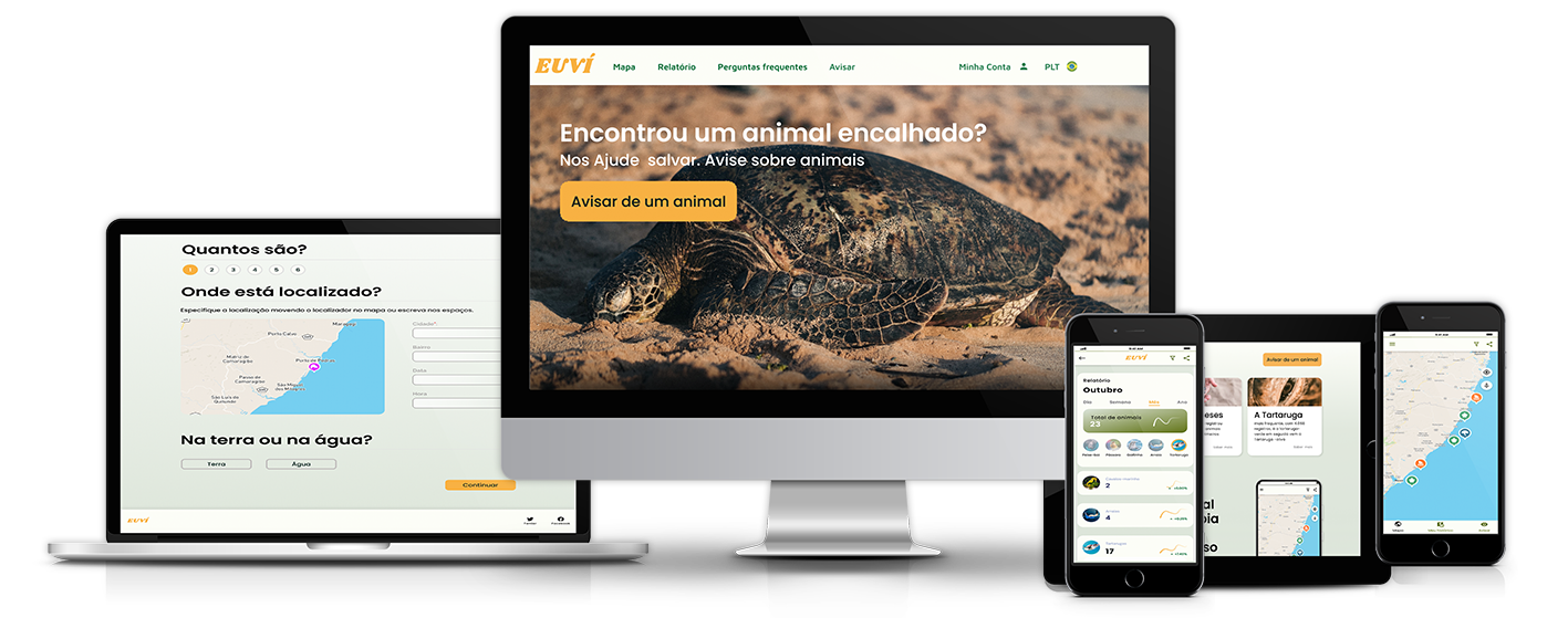 Eu Vi is a mobile and web application designed to help users report sightings of endangered aquatic animals efficiently. By providing details like location and condition, users ensure that the appropriate rescue team is notified quickly.